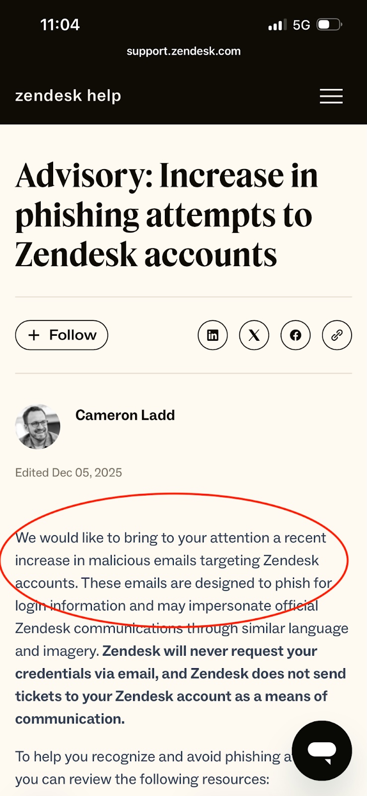 In recent months, Zendesk has publicly warned users about a rise in phishing attempts targeting helpdesk accounts. Attackers are increasingly exploiting social engineering tactics to impersonate customers, manipulate agents, and extract sensitive information.